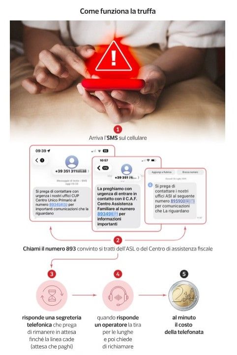 Il messaggio l’hanno ricevuto decine di migliaia di italiani: «Si prega di contattare con urgenza i nostri uffici Cup, Centro unico primario, al numero 893… per importanti comunicazioni che la riguardano». Oppure di contattare il Caf, o l’Asi. Sembra che l’sms arrivi dal servizio prenotazioni dell’Asl, o dal centro di assistenza fiscale. Vuoi non richiamare subito? Spesso risponde una segreteria telefonica che ti prega di rimanere in attesa per non perdere la priorità acquisita, fino a quando la linea si interrompe. Quando invece risponde un operatore, ti chiede con tono professionale le generalità, ti fa attendere per verificare al terminale qualcosa, la tira per le lunghe senza dirti qual è l’importante comunicazione che ti riguarda. «Attenda un attimo»… musichetta… cade la linea. Richiami, e la trafila riparte. È una truffa che costa 2 euro al minuto e di cui ti accorgi solo quando arriva la bolletta.