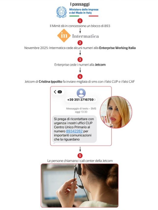 Il 27 novembre 2025, Intermatica cede questo e altri 893 alla Enterprise Working Italia, che ha sede legale nello studio di un commercialista di Roma. La proprietà è collegata a un canale tv locale attivo tra Lombardia e Piemonte, che trasmette teleshopping; e infatti Enterprise si occupa di pubblicità per trasmissioni tv, ma anche di rivendere, a sua volta, i numeri a sovrapprezzo. A inizio gennaio 2026 cede il «nostro» e almeno altri quattro 893 che nelle ultime settimane sono stati usati per le truffe (sia con i falsi Cup che con i falsi Caf) alla Jetcom Srl, sede legale a Roma, sede operativa a Napoli. Titolare, un’insospettabile negoziante, Cristina Ippolito, 49 anni, originaria di Portici. Le sue operatrici lavorano da casa, e fanno consulenze sui numeri del lotto, ma soprattutto telefonate erotiche. Infatti, sempre alla Ippolito fa capo la Cristel Communication, che gestisce il sito a luci rosse 69incontri.it, che propone «ragazze e donne mature pronte a esaudire i tuoi desideri» per 2 euro al minuto. Nei mesi scorsi, anche quei numeri apparivano negli sms delle false «comunicazioni urgenti».