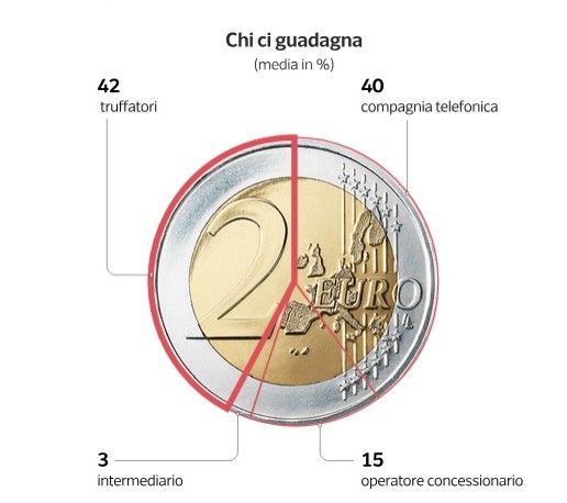 Quanto intascano i truffatori sui 2 euro al minuto che vengono addebitati sulla bolletta? Tutto dipende dagli accordi commerciali tra le singole parti della «filiera»: la compagnia telefonica trattiene tra il 30 e il 50%, il resto lo versa alla società che ha preso in concessione il numero dal Mimit, la quale si tiene una quota (nel caso di Intermatica, il 10-15%) e paga quel che rimane al cliente, che a sua volta – se non lo usa direttamente ma fa da intermediario – trattiene una parte, (alla Enterprise va il 3%) e versa il resto al call center. Su tutto, ci guadagna pure lo Stato: il 22% di Iva, oltre ai 664mila euro che il Mimit incassa ogni anno dalle concessioni degli 89.