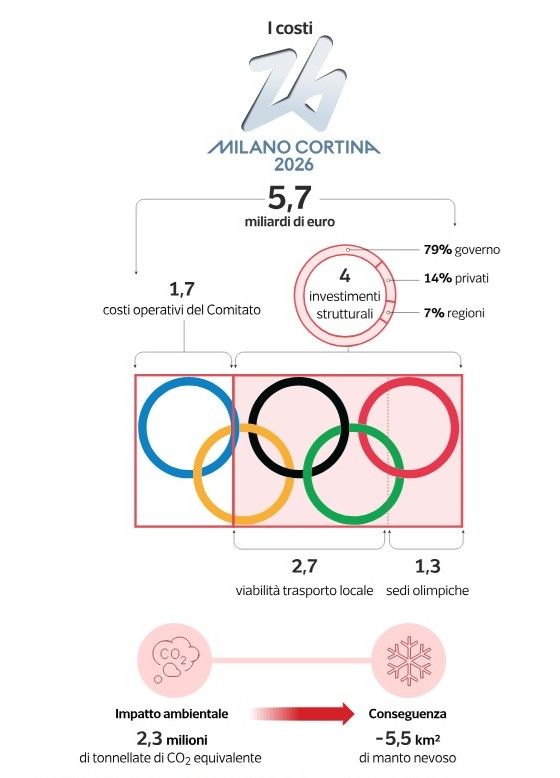 Meno di un terzo è servito per le competizioni sportive, il resto se n’è andato in infrastrutture: dalle strade, alle piste, ai villaggi per gli atleti. L’impatto ambientale complessivo, inclusi gli spostamenti degli spettatori, è calcolato in 2,3 milioni di tonnellate di anidride carbonica equivalente, che causeranno la perdita di 5,5 km quadrati di manto nevoso. (Qui). A eccezione dei miglioramenti effettuati sulla viabilità, secondo gli analisti di S&P Global i Giochi «non lasceranno un’eredità economica significativa a lungo termine». E il lungo termine lascia spesso strutture abbandonate. Ricordiamo tutti i resti di «Torino 2006», con impianti come la pista da bob di Cesana Torinese costata 110 milioni di euro e che ora ne costerà altri 9 per essere demolita.