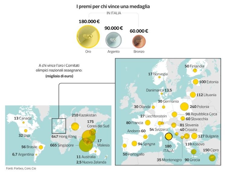 Il Cio continua a distribuire le medaglie agli atleti, mentre ogni Paese è libero di assegnare un premio economico. Per Milano Cortina il Coni ha previsto 180 mila euro per chi vince l’oro, 90 mila per l’argento, 60 mila per il bronzo. Negli Usa 32 mila euro per l’oro, a Singapore. 665 mila, in Nuova Zelanda 2.500, nella Corea del Sud 175 mila euro più esenzione militare. In Polonia, l’oro vale 240 mila euro, ma lo Stato offre anche un’automobile e un appartamento, la Macedonia del Nord dà un vitalizio mensile di 1.100 euro. Gli atleti che vincono le medaglie poi fanno il pieno con gli sponsor.