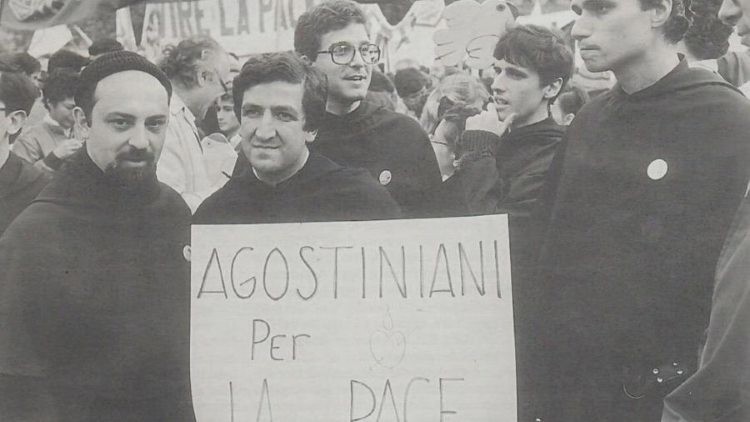 Da qualche giorno – grazie a Luca Casarini che l’ha recuperata e postata su Facebook – circola sui social (e su alcune testate) una fotografia che oggi, evidentemente ben oltre le intenzioni di quando fu scattata, assume un valore storico: ritrae un giovane religioso agostiniano, Robert Francis Prevost – oggi papa Leone XIV –, durante una manifestazione di piazza, insieme a quattro confratelli, dietro un cartello scritto a mano “Agostiniani per la pace”.