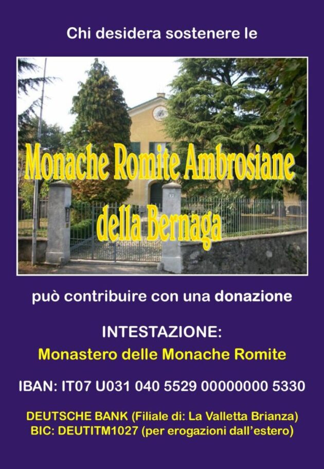 Il 24 ottobre, sarà celebrata la Messa solenne, presieduta da Mons. Walter Magni, nell’anniversario della morte di Madre Candida, che aveva aperto il Monastero della Bernaga. Felice e provvidenziale coincidenza!